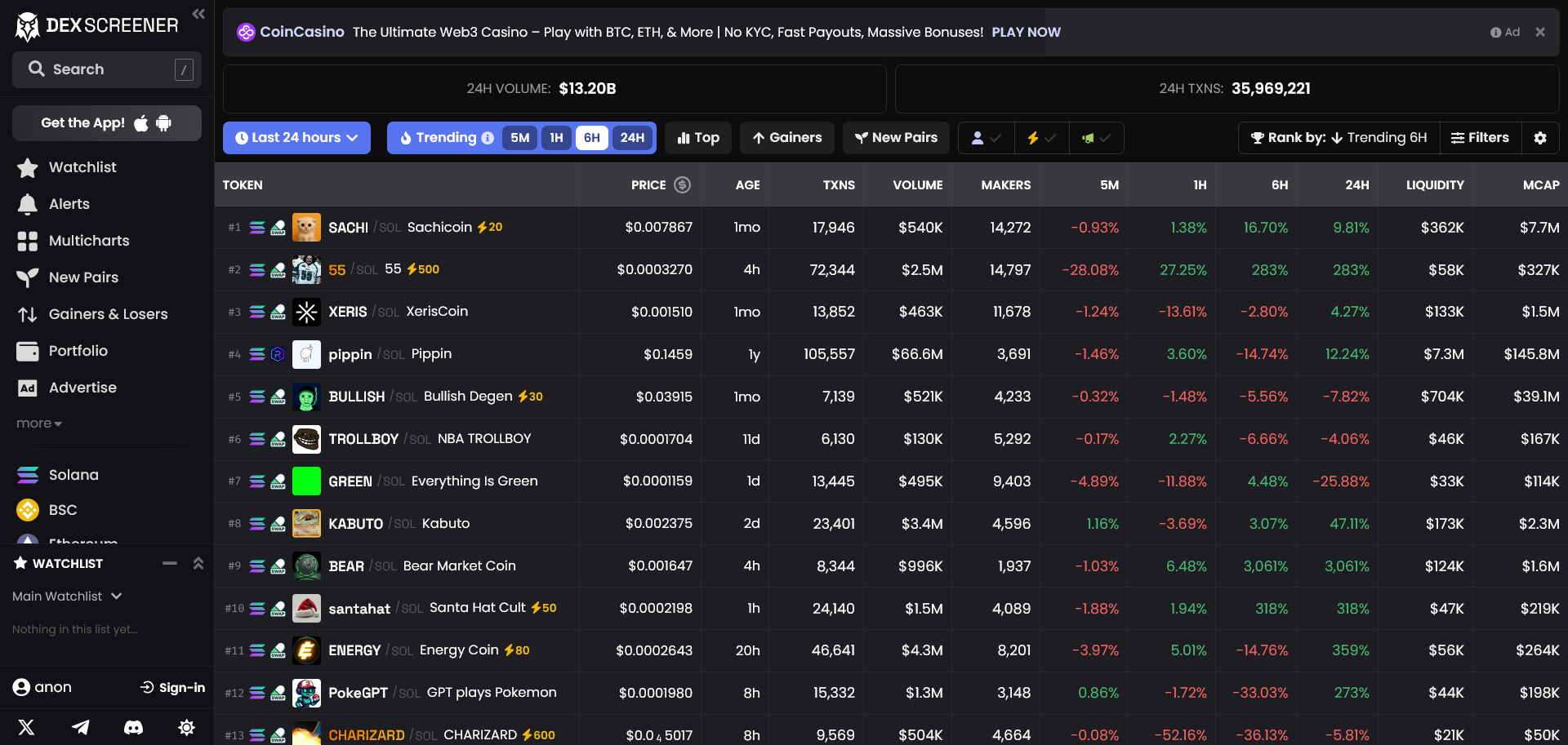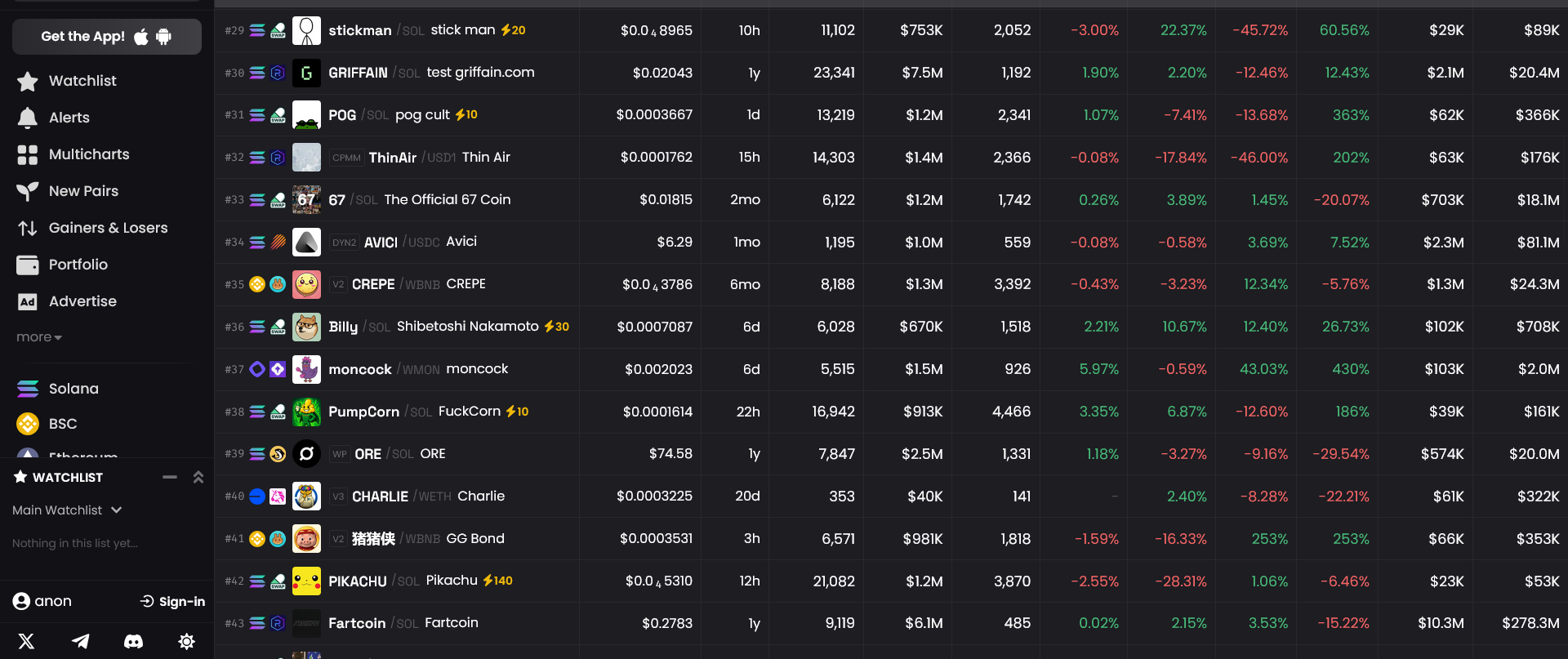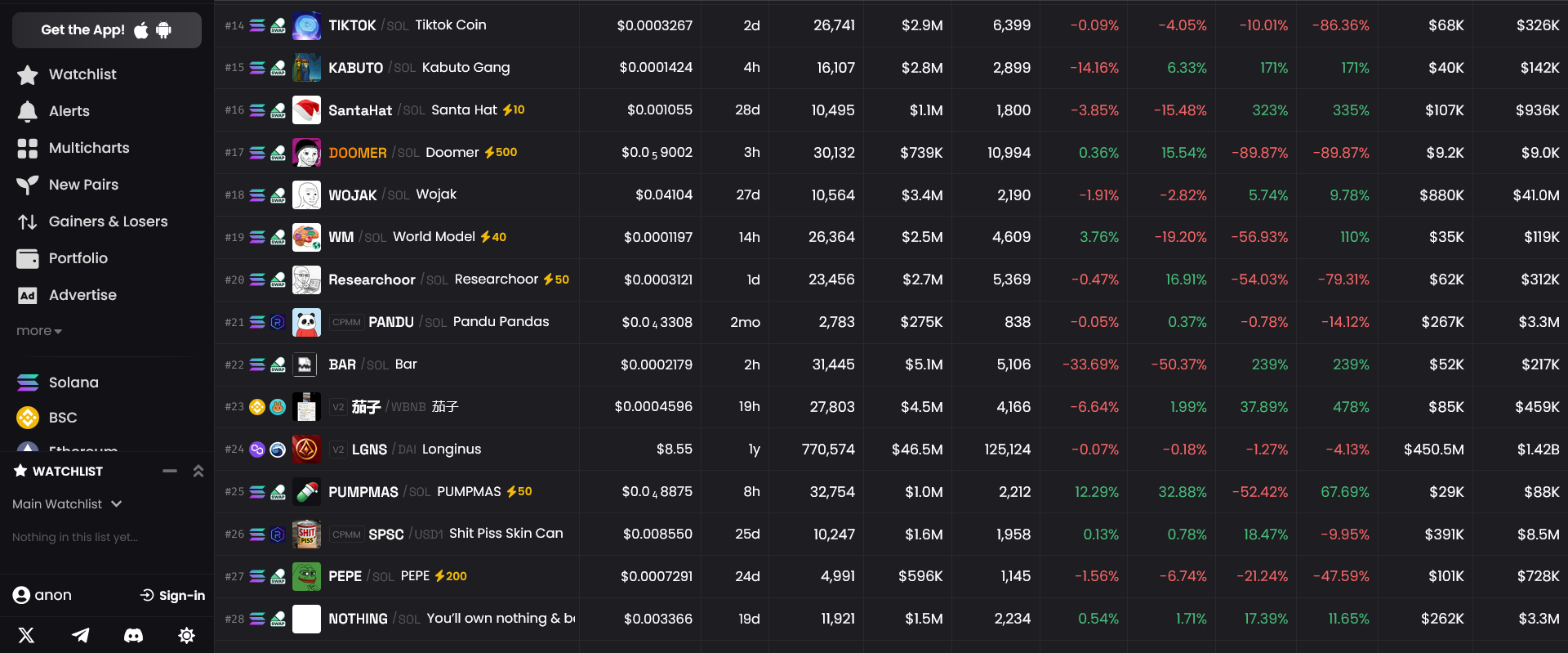 The platform supports a wide range of networks, including Ethereum, BNB Chain, Solana, Arbitrum, Base, Polygon, Avalanche, and many others. This multi-chain coverage makes Dexscreener especially useful for traders hunting for early-stage tokens and emerging narratives.